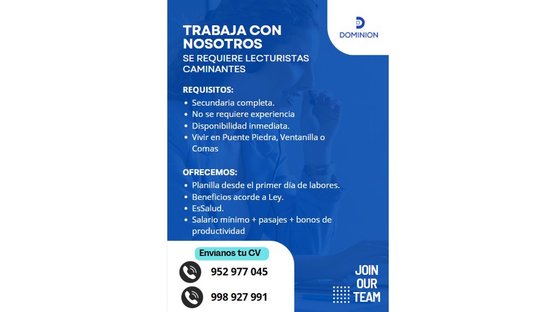 En esta emocionante posición como Lecturista o Repartidor en Calidda, tendrás la oportunidad de formar parte de nuestro equipo. Tu labor principal será desplazarte por las zonas de SAN JUAN DE LURIGANCHO y CALLAO para llevar a cabo la lectura de medidores de manera eficiente y precisa. Como miembro Junior de nuestro equipo, tendrás la responsabilidad de garantizar la correcta lectura de los medidores y reportar la información de manera oportuna a nuestros sistemas.